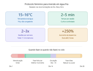Eu não faço banheira de gelo todo dia. Faço quando sinto que preciso – depois de uma semana intensa, quando quero um “reset” no sistema nervoso. A Dra. Stacy Sims, fisiologista especializada em performance feminina, é bem clara: “mulheres não são homens pequenos” e a dose de frio precisa respeitar isso.
